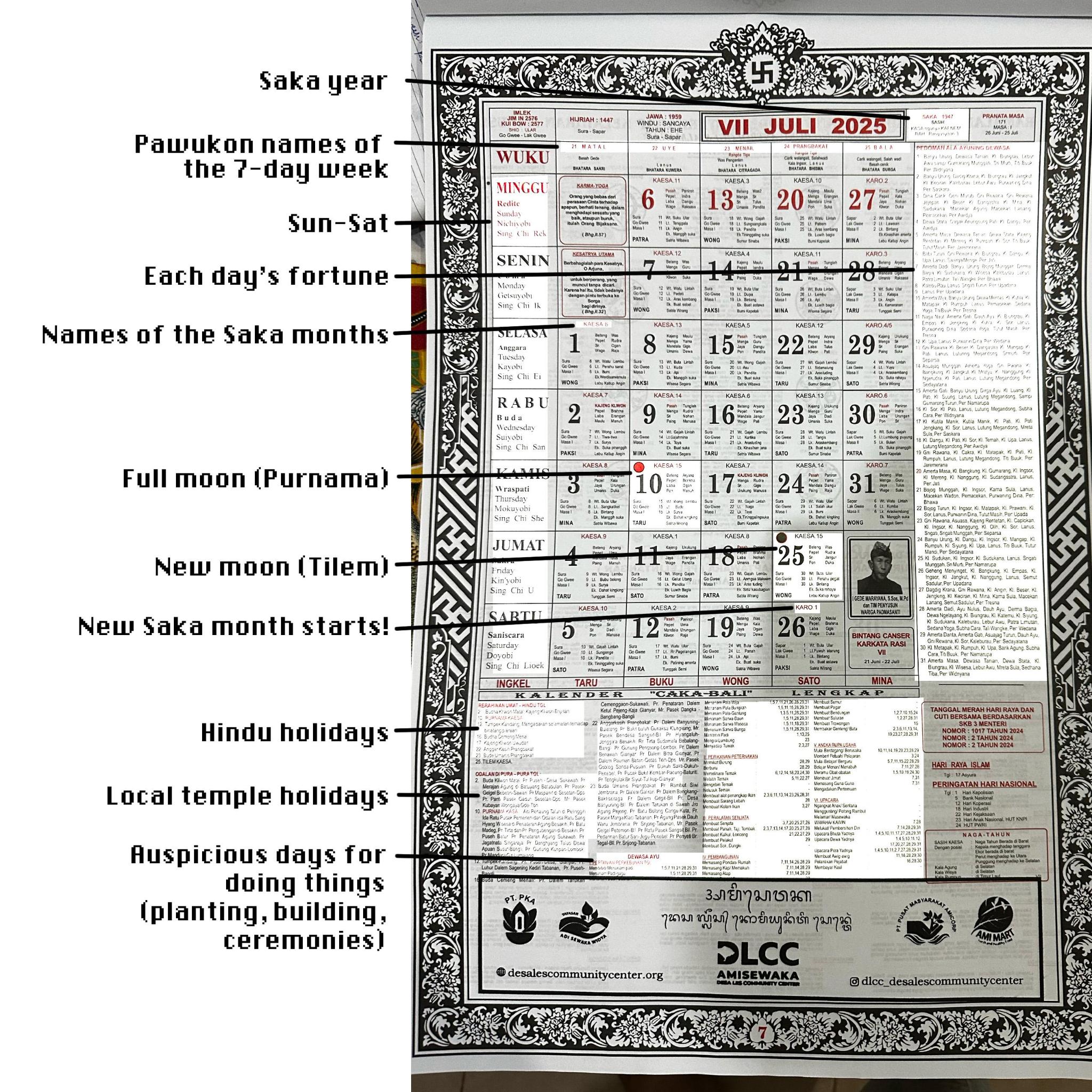 The Saka calendar has 12 sasih (months), with roughly 15 days of waxing moon and 15 days of waning moon. Important eves in this calendar are the eve of Tilem (new moon) and the eve of Purnama (full moon). Nyepi, the day of silence, happens on every new Saka year.