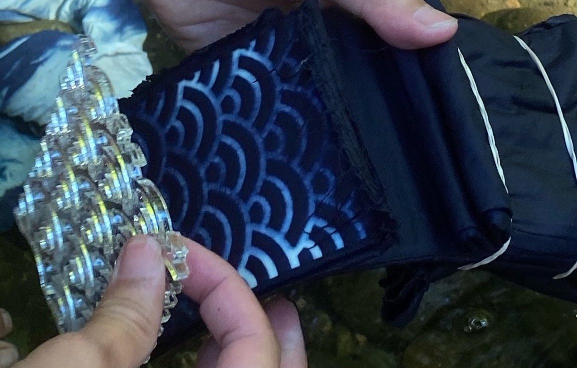 The template is a stiff, 2d material, where cuts are made equally spaced apart, and fabric is squeezed through in order to create a pattern in the dye. The picture sparked the idea that digital fabrication can be used to make the tools that aid crafting in new ways. What new processes might arise if I combined digital fabrication with traditional dyeing?