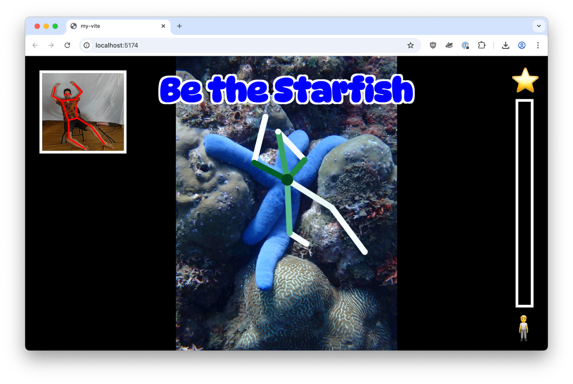 Humans anthropomorphize everything they come across, and starfish are no exception. We’ve created a game where we ask humans to imitate starfish poses in order to become starfish. Players are shown a starfish from a collection of starfish photos (photos: Paula) and a camera streaming to a browser program running MoveNet detects whether or not you’ve matched the starfish pose.