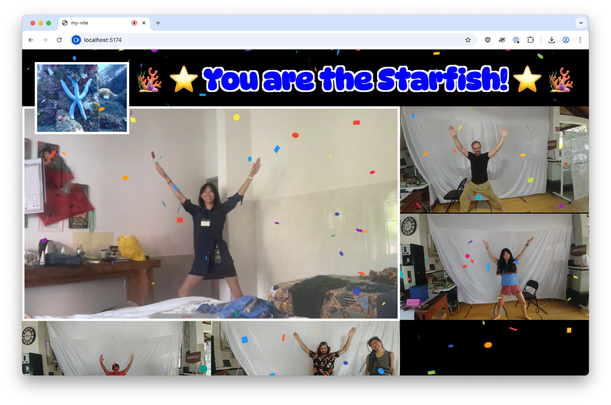 The closer your pose gets to matching the starfish pose, the greener your avatar becomes, and the higher the star-o-meter rises. When you win, your picture is taken and displayed amongst all the previous winners who became that starfish. Winning is a source of pride and silliness to most players. Alex Bachmeyer says, “You’re so focused on the starfish pose that you forget what your face looks like.” When we contemplated that the game was too hard and that we could lower the threshold for pose accuracy, Josh Muffin Gordonson says, “It’s important to struggle in order to win.” So we kept it that way.
