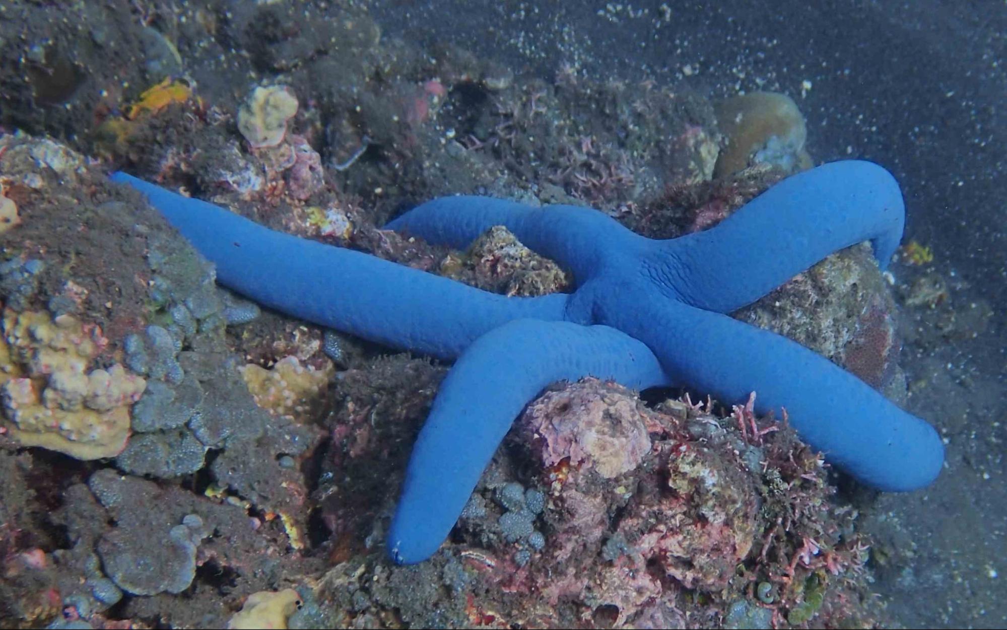 One of the most fun and classic creatures to spot in Les are the blue Linckia starfish. They live in sub-tidal waters, close enough to the surface that snorkelers can find them amongst the rocks and coral. The typical blue starfish is found posed in classic star pose, with its five arms outstretched. However, you can also find blue starfish in many other poses such as lounging, folded, hands up, and squished.
